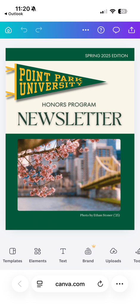 I also began planning how I will approach the Spring 2026 newsletter. My goal is to maintain Point Park University’s brand identity while elevating the overall design to feel more modern and cohesive. I am considering how to improve photo placement, tighten typography consistency, and create stronger visual alignment throughout the pages.