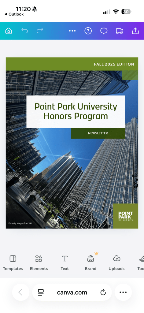 During the meeting, we reviewed previous Honors Program newsletter templates from past semesters. We discussed layout structure, branding consistency, typography choices, and how the visual hierarchy guides the reader through the publication. Looking at the Fall 2025 and Spring 2025 editions helped me understand what elements need to stay consistent (branding, color palette, overall format) and where there is room for improvement or modernization.