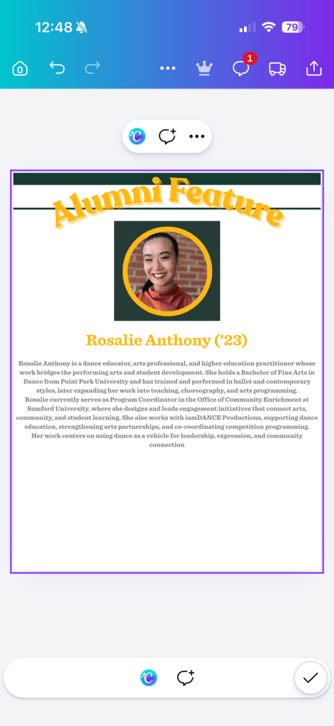 After selecting her, I created a dedicated alumni spotlight page based on the existing newsletter template. This included formatting her name and designing the layout to fit within the established style of the newsletter. I also incorporated her photo and worked on balancing the visual elements with the text so the page feels clean and easy to read.
