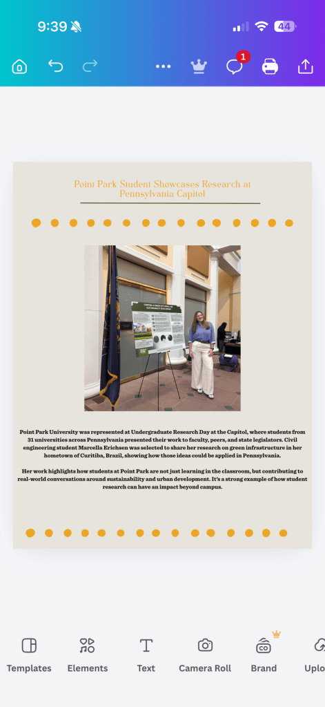 For this portion of the newsletter, I worked on highlighting a student research event at the Pennsylvania Capitol. I spent time organizing the layout, placing the image, and formatting the text so that it clearly communicates the importance of the event while still fitting within the overall design of the newsletter.